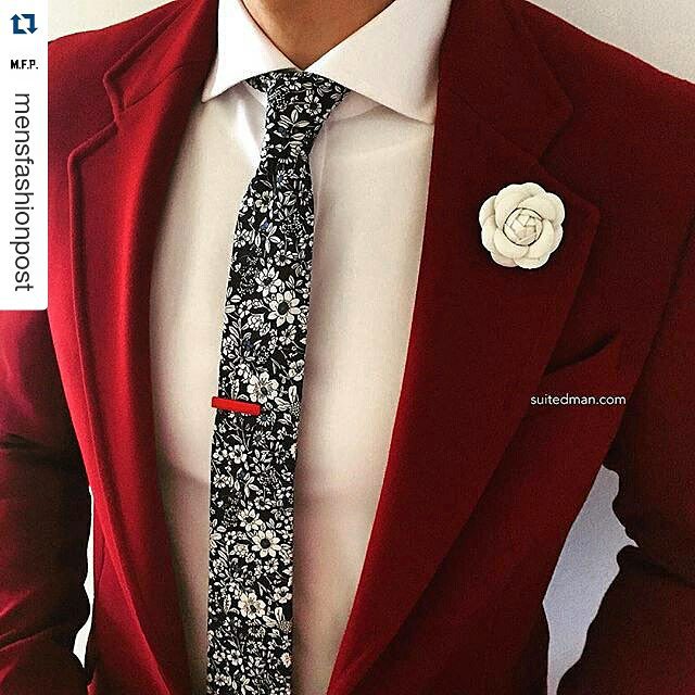 ・・・Loving the accessories and stylings from @Suited_Man including their wide selection of floral ties and lapel pins. Get them now at www.suitedman.com | Follow @suited_man Suit up! @suitedmanstyle | I really like the colour combo, red, black and white always look great together. This will look especially great this autumn. #MenswearMonday #VictoryforuFashion Be Victorious Everyday.